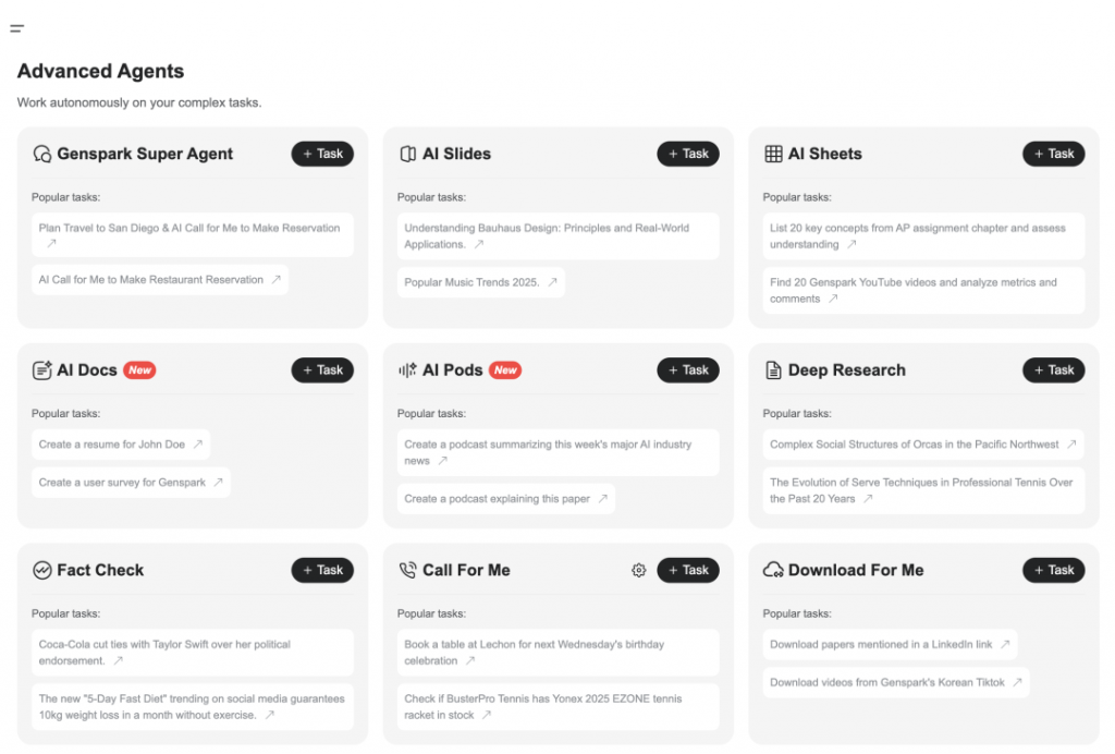 Genspark Super Agent上线以来,先后推出多个子代理(sub-agent),丰富内置功能模块: